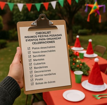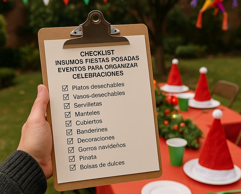 Con este checklist insumos fiestas posadas eventos, podrás asegurarte de que no falte nada y que tu evento se desarrolle sin contratiempos, desde vajilla hasta decoraciones y artículos de limpieza.