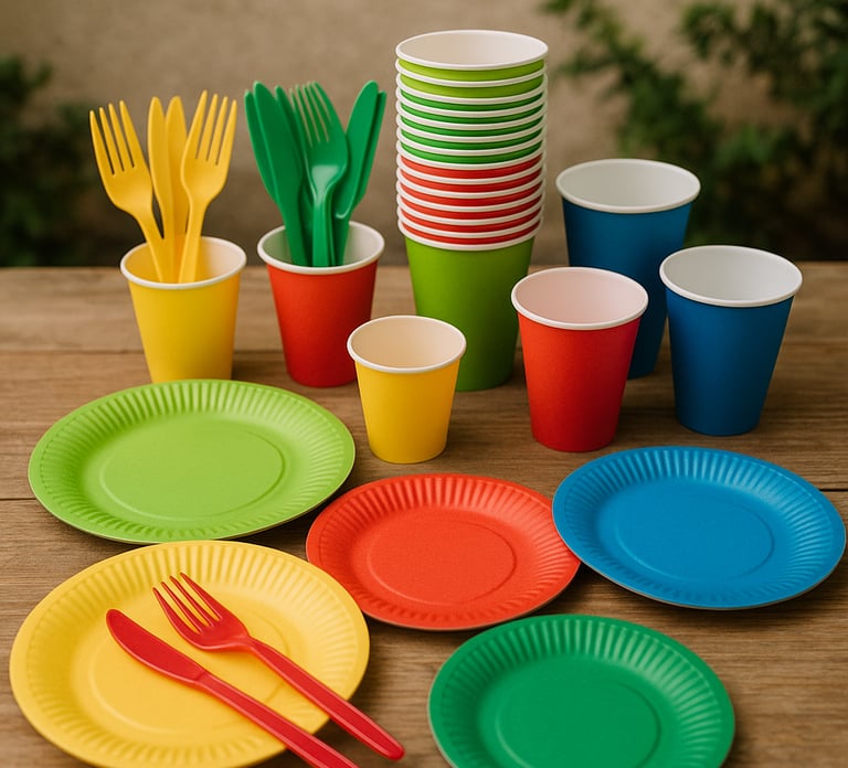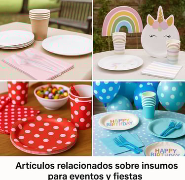 Los platos, vasos y cubiertos desechables son esenciales en cualquier evento. Según la temática, puedes incluir opciones coloridas o neutras. Tener estos elementos en cantidad suficiente es clave para que los invitados disfruten sin preocupaciones.