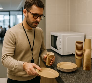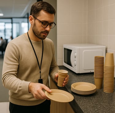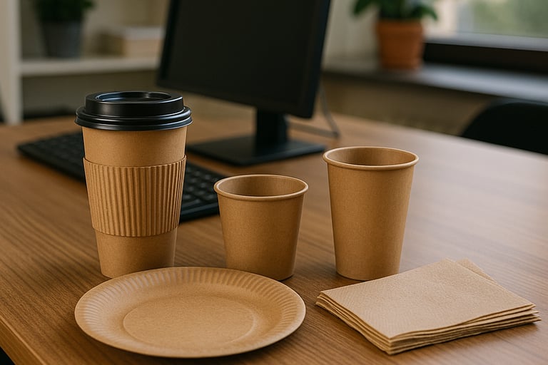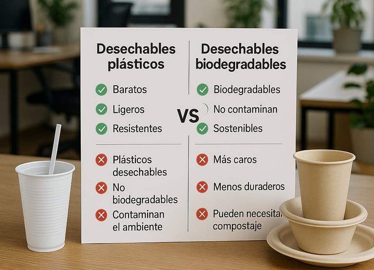 Al comparar, muchas oficinas optan por combinar ambos: plásticos para grandes volúmenes y biodegradables en reuniones o eventos especiales.