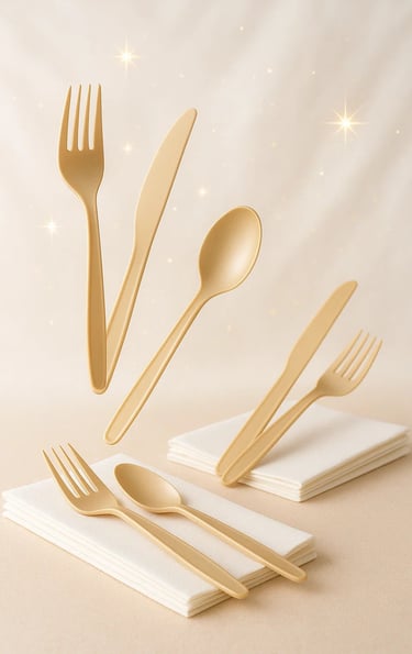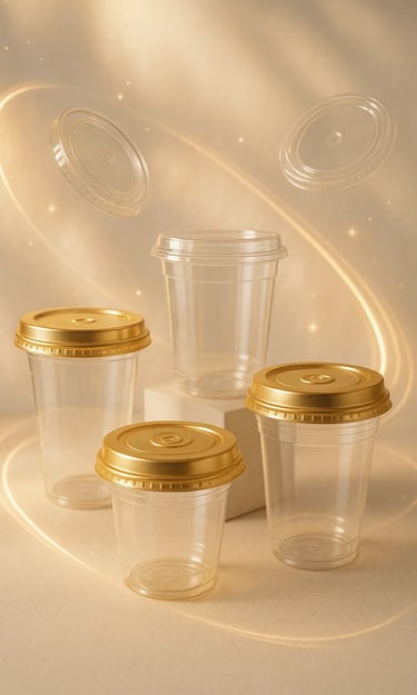 Plástico o cartón; prácticos, higiénicos y apilables para servicio rápido.